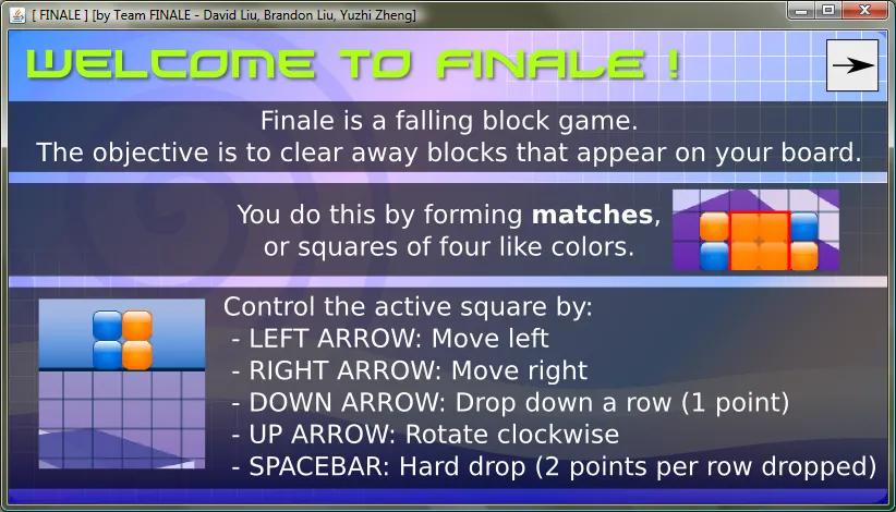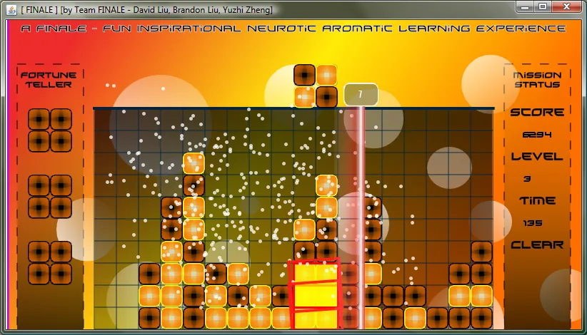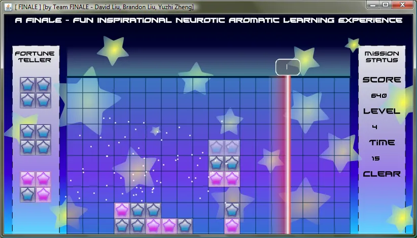 I worked with Brandon Liu and Yuzhi Zheng to develop FINALE, a falling block game based on the PSP game Lumines. The object of the game is to match colored blocks into squares, which are cleared away when the “time bar” passes them. Clearing more squares in each pass of the time bar gives an exponentially larger number of points.